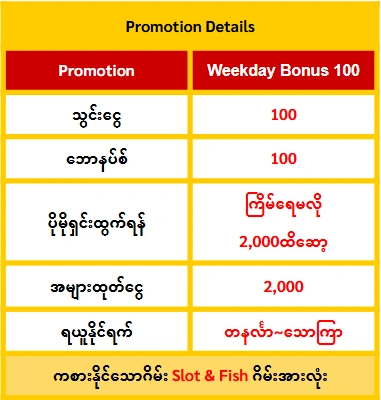 3.သွင်းငွေ 10,000 ကျပ် ဘောနပ် 10,000 ကျပ် ကြိမ်ရေတွက်စရာမလိုဘဲ နိုင်မှတ် 200,000 ကစားလိုက်ရုံနဲ့ 2သိန်းထိထုတ်နိုင်ပါသည်။