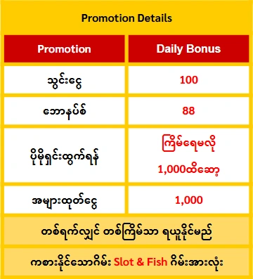 3.သြင္းေငြ 10,000 က်ပ္ ေဘာနပ္ 8,800 က်ပ္ ႀကိမ္ေရတြက္စရာမလိုဘဲ ႏိုင္မွတ္ 100,000 ကစားလိုက္႐ုံနဲ႔ 1သိန္းက်ပ္ထိထုတ္ႏိုင္ပါသည္။